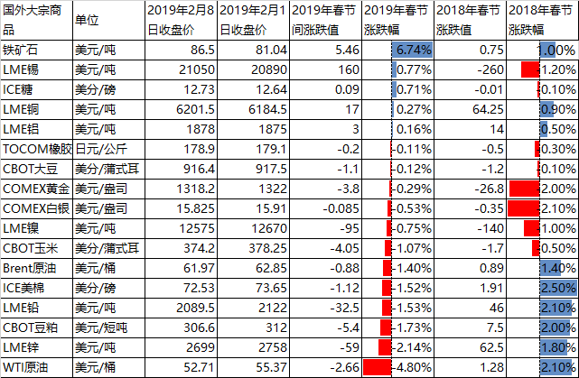 2019年春節(jié)期間,受對(duì)世界經(jīng)濟(jì)增長放緩的擔(dān)憂大宗商品價(jià)格基本以小幅度下跌為主,其中尤以原油價(jià)格下跌為甚。