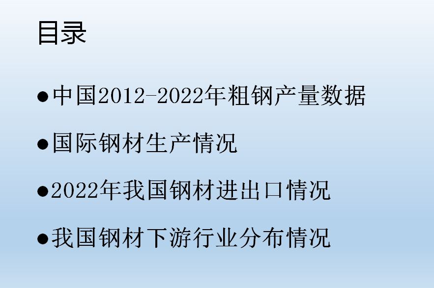•我國現(xiàn)階段已經(jīng)初步實(shí)現(xiàn)城鎮(zhèn)化的建設(shè),隨著房地產(chǎn)需求的下滑,我們普通鋼材很難有一個大的增量,但是我國的特殊鋼材還有很大的發(fā)展空間。結(jié)合國家鋼材發(fā)展現(xiàn)狀,我們也慢慢的理解公司制定“高端、國有、人無我有”政策的現(xiàn)實(shí)依據(jù),希望大家能出通過了解行業(yè)發(fā)展的方向,明確目標(biāo),開發(fā)客戶,更好的規(guī)劃自己的銷售,取得好的業(yè)績。